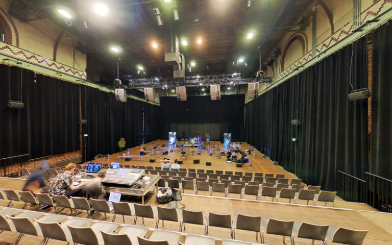 Das Radialsystem in Berlin in der Nähe des Ostbahnhofs ist ein Ort, an dem zeitgenössische Kunst entwickelt, erprobt und präsentiert wird – insbesondere in den Bereichen Choreografie, Musiktheater und Konzert. Es verfügt über zwei Veranstaltungsräumlichkeiten, die einfach als „Saal“ bzw. „Halle“ bezeichnet werden. Um letztere soll es im vorliegenden Beitrag gehen. Die Halle im Radialsystem war bisher ganz klassisch mit einer Stereo-Beschallung versorgt worden. Im vergangenen Jahr wurde ein neues, immersives Beschallungssystem auf der Basis des L-ISA-Systems von L-Acoustics installiert, das die Möglichkeiten der Tontechnik immens erweitert. Für das Team vom Radialsystem war dies ein sehr sinnvoller Schritt, weil zum Veranstaltungsprogramm auch regelmäßig zeitgenössische Tanz- und Musikproduktionen gehören, die eher experimentellen Charakter haben und über die reine Abbildung einer konzertanten Situation auf der Bühne hinaus immer wieder auch klangexperimentelle Ansätze verfolgen. Bisher wurden solche Produktionen dann beispielsweise quadrophonisch oder achtkanalig gefahren – mit dem neuen L-ISA System sind die tontechnischen Möglichkeiten nun weitaus vielfältiger. Bei einem Besuch in Berlin konnten wir uns von den Qualitäten des neuen Systems überzeugen.